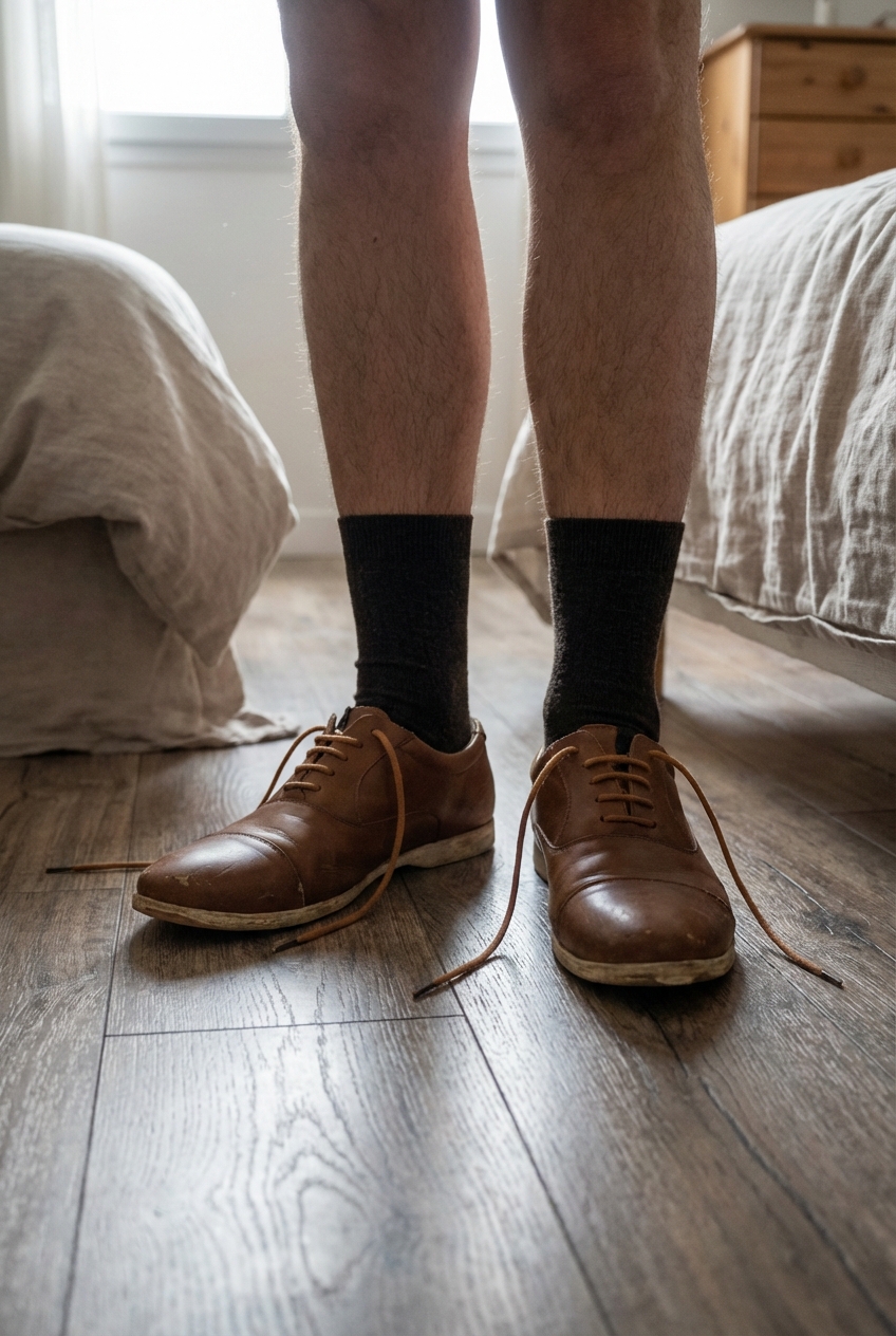 Chaussure de ville Casual Gemo debout, face à la caméra, dans une chambre à la lumière douce, avec une lumière naturelle filtrant par la fenêtre.