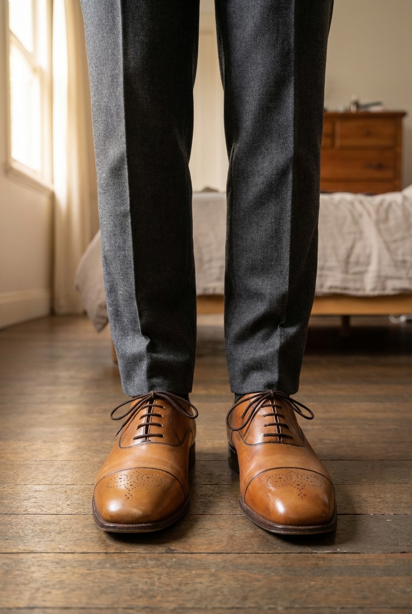 Chaussures Bally homme – Richelieu cognac élégantes – Taille 42,5 debout, face à la caméra, dans une chambre à la lumière douce, avec une lumière naturelle filtrant par la fenêtre.