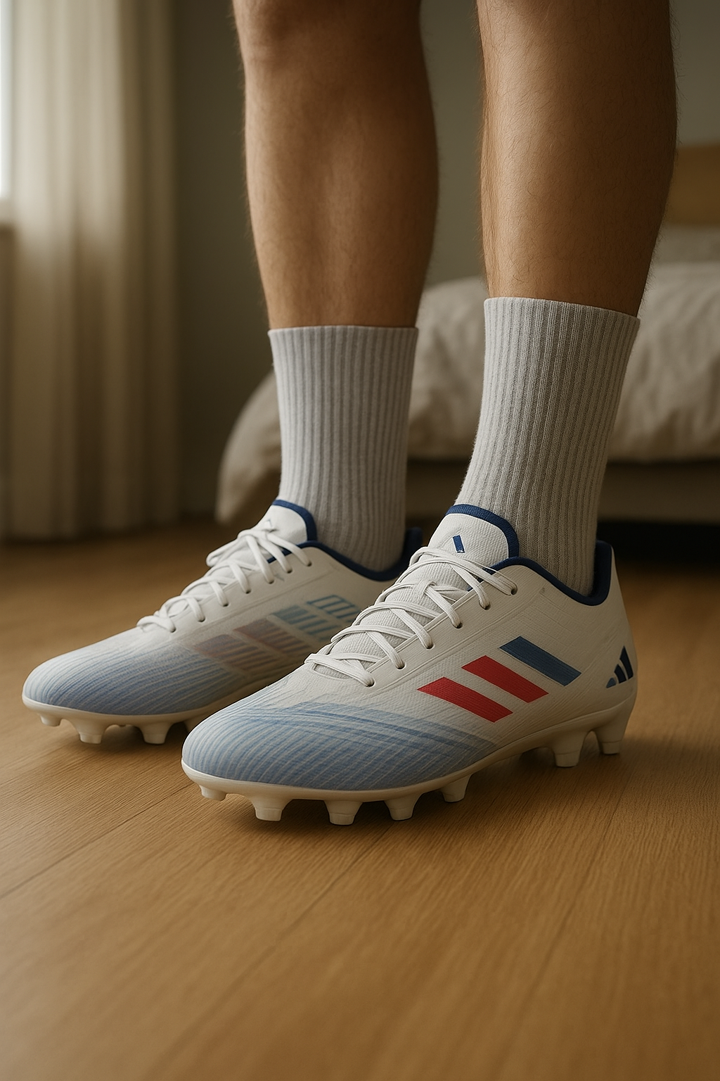 Chaussures du foot Adidas debout, face à la caméra, dans une chambre à la lumière douce, avec une lumière naturelle filtrant par la fenêtre.