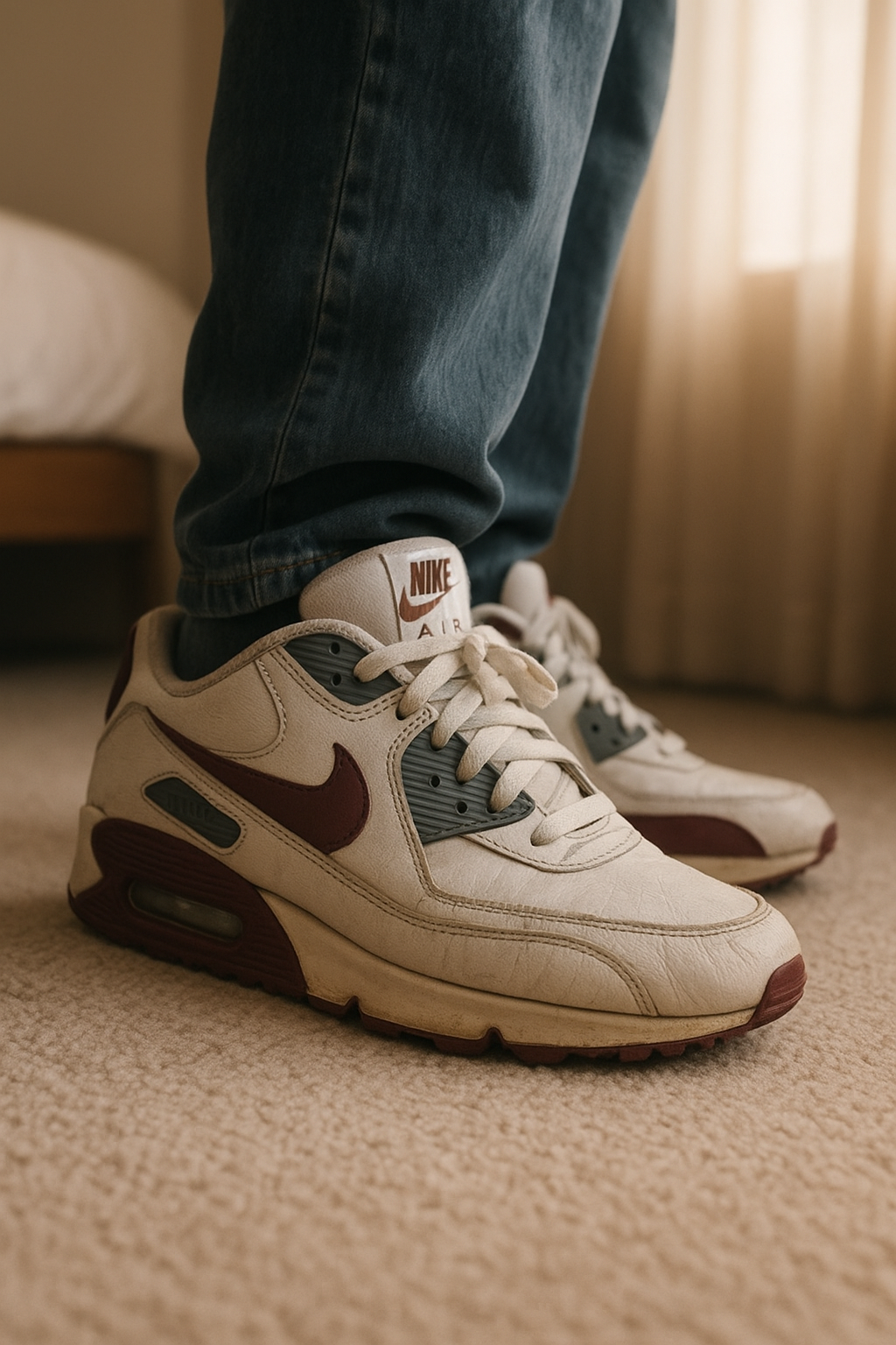 Chaussures Nike Air Flight blanche et bordeaux debout, face à la caméra, dans une chambre à la lumière douce, avec une lumière naturelle filtrant par la fenêtre.