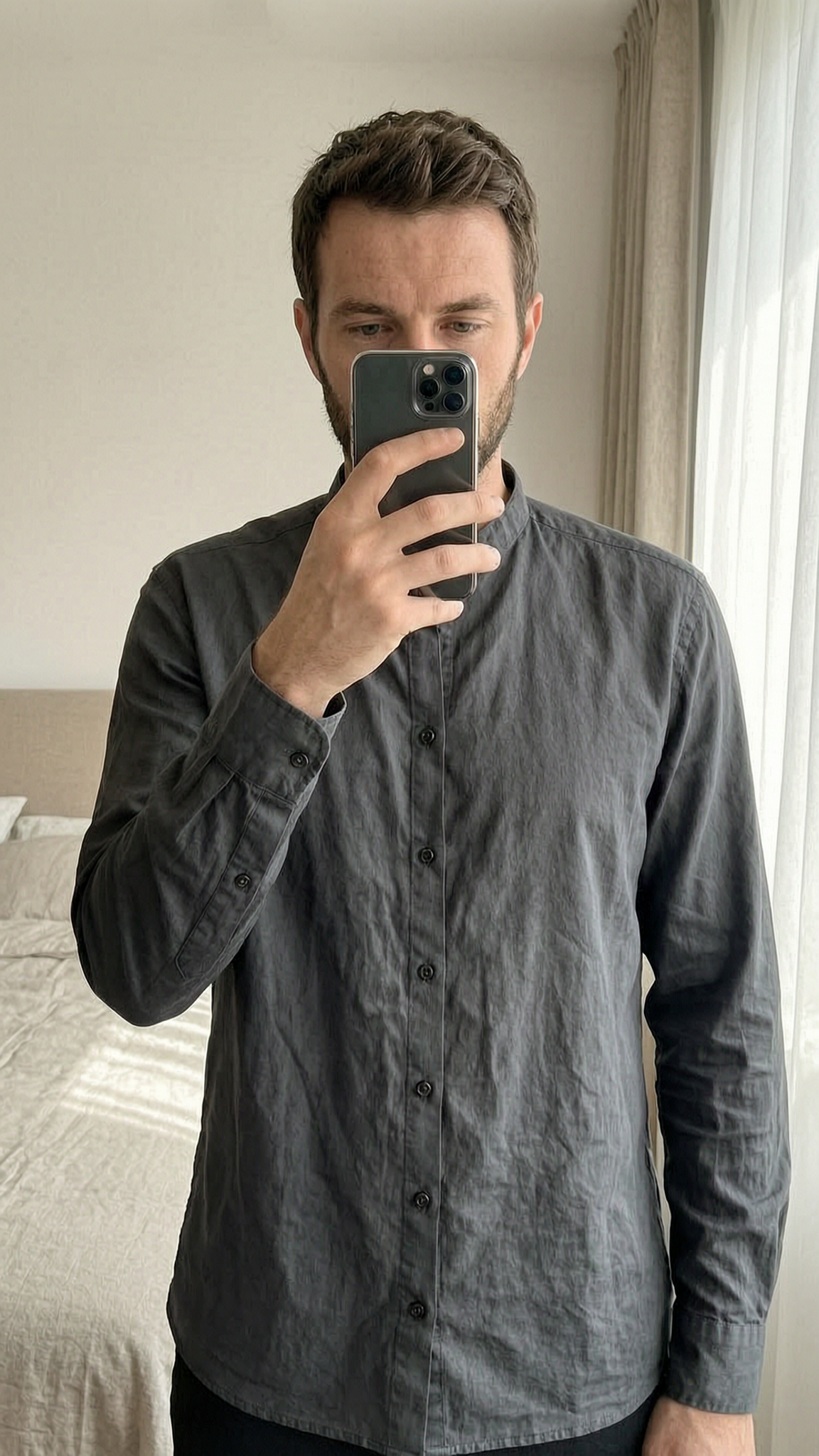 Chemine Devred debout, face à la caméra, dans une chambre à la lumière douce, avec une lumière naturelle filtrant par la fenêtre.