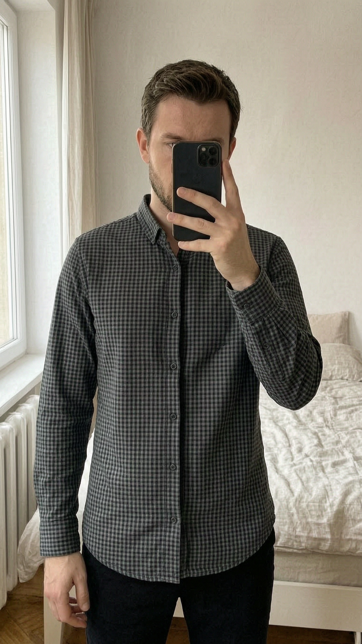 Chemine IKKS debout, face à la caméra, dans une chambre à la lumière douce, avec une lumière naturelle filtrant par la fenêtre.