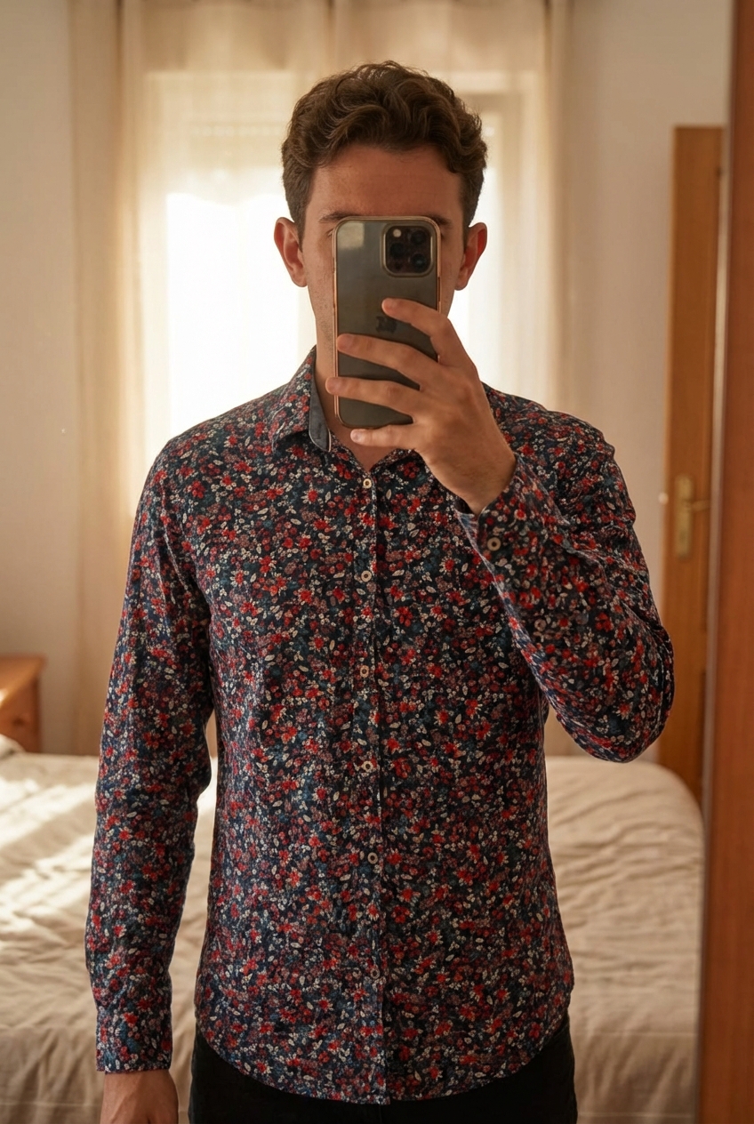 Une personne en Chemise debout, face à la caméra, dans une chambre à la lumière douce, avec une lumière naturelle filtrant par la fenêtre.