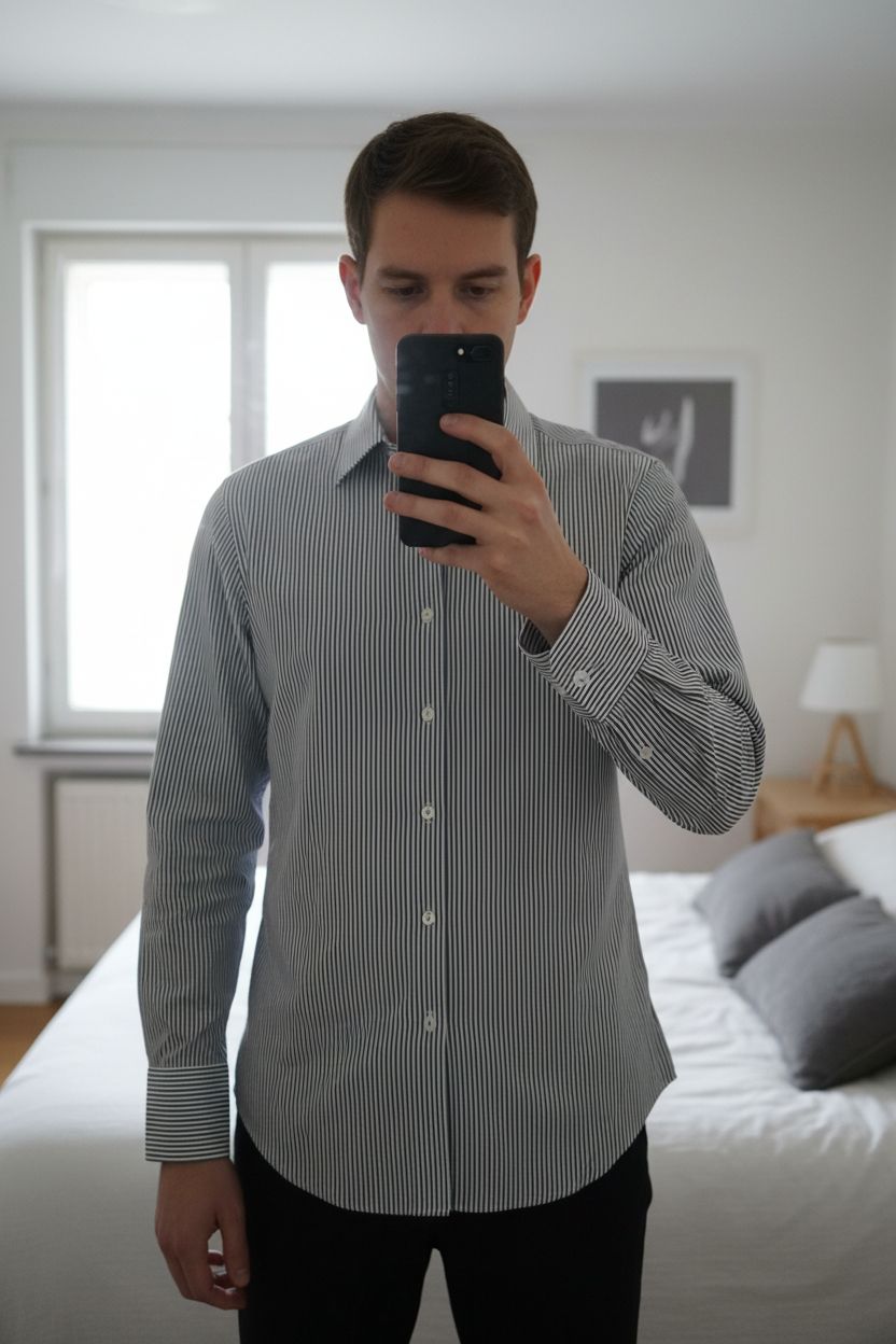 Chemise blanche et bleu rayée coupe Slim Fit - J. Crew - L / 40 debout, face à la caméra, dans une chambre à la lumière douce, avec une lumière naturelle filtrant par la fenêtre.