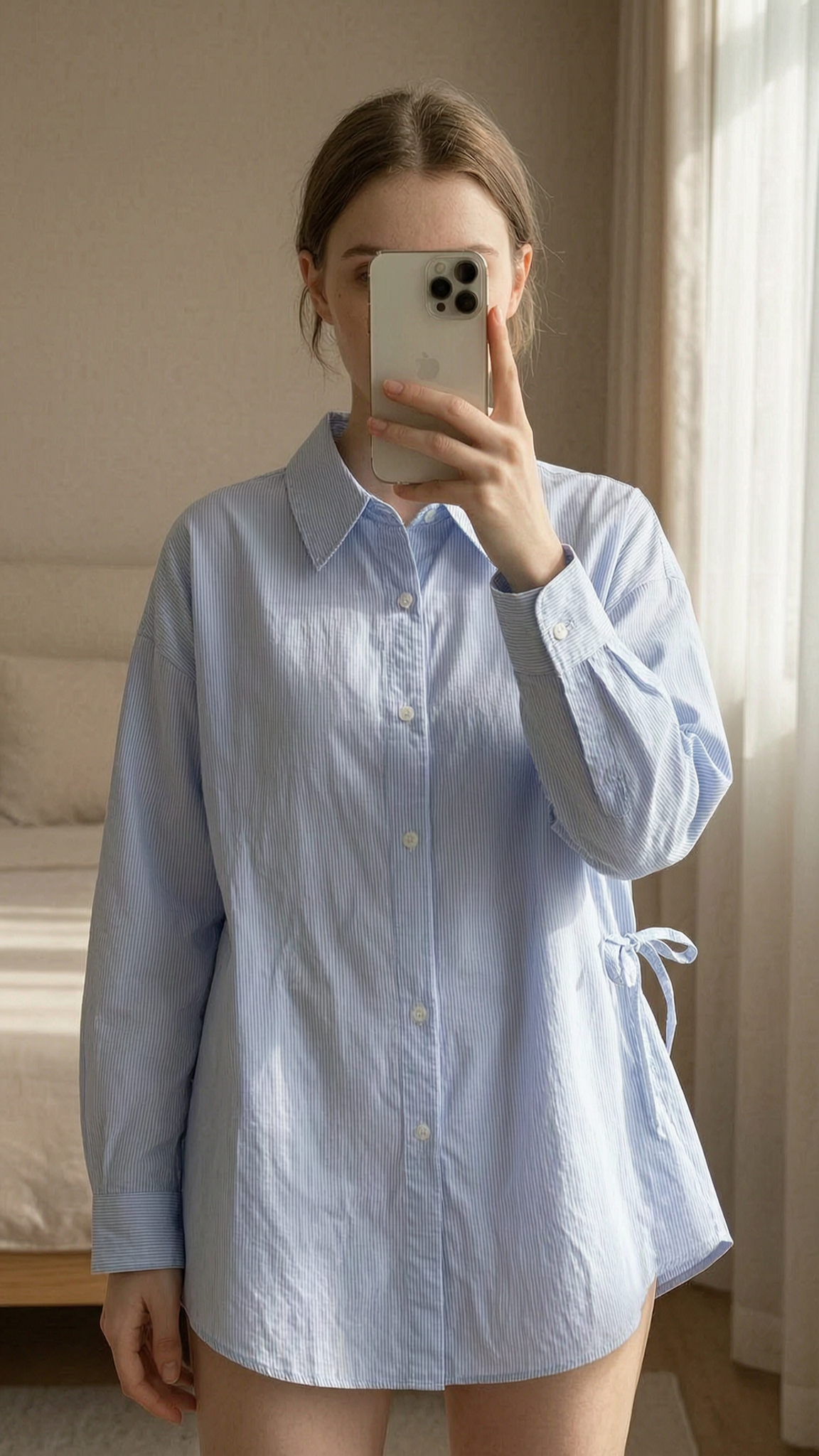 Chemise bleu clair rayée oversize nœud dos manches longues L debout, face à la caméra, dans une chambre à la lumière douce, avec une lumière naturelle filtrant par la fenêtre.