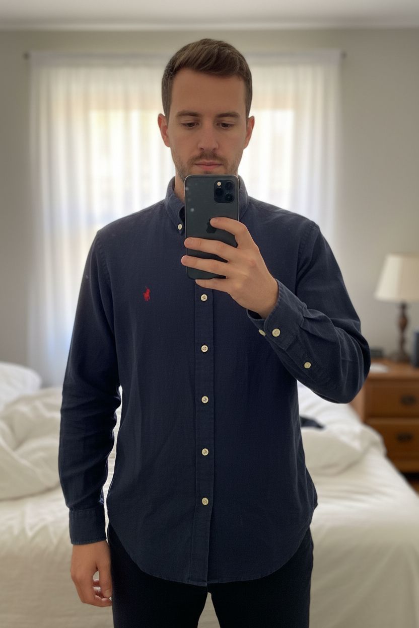 Chemise bleue marine Ralph Lauren debout, face à la caméra, dans une chambre à la lumière douce, avec une lumière naturelle filtrant par la fenêtre.