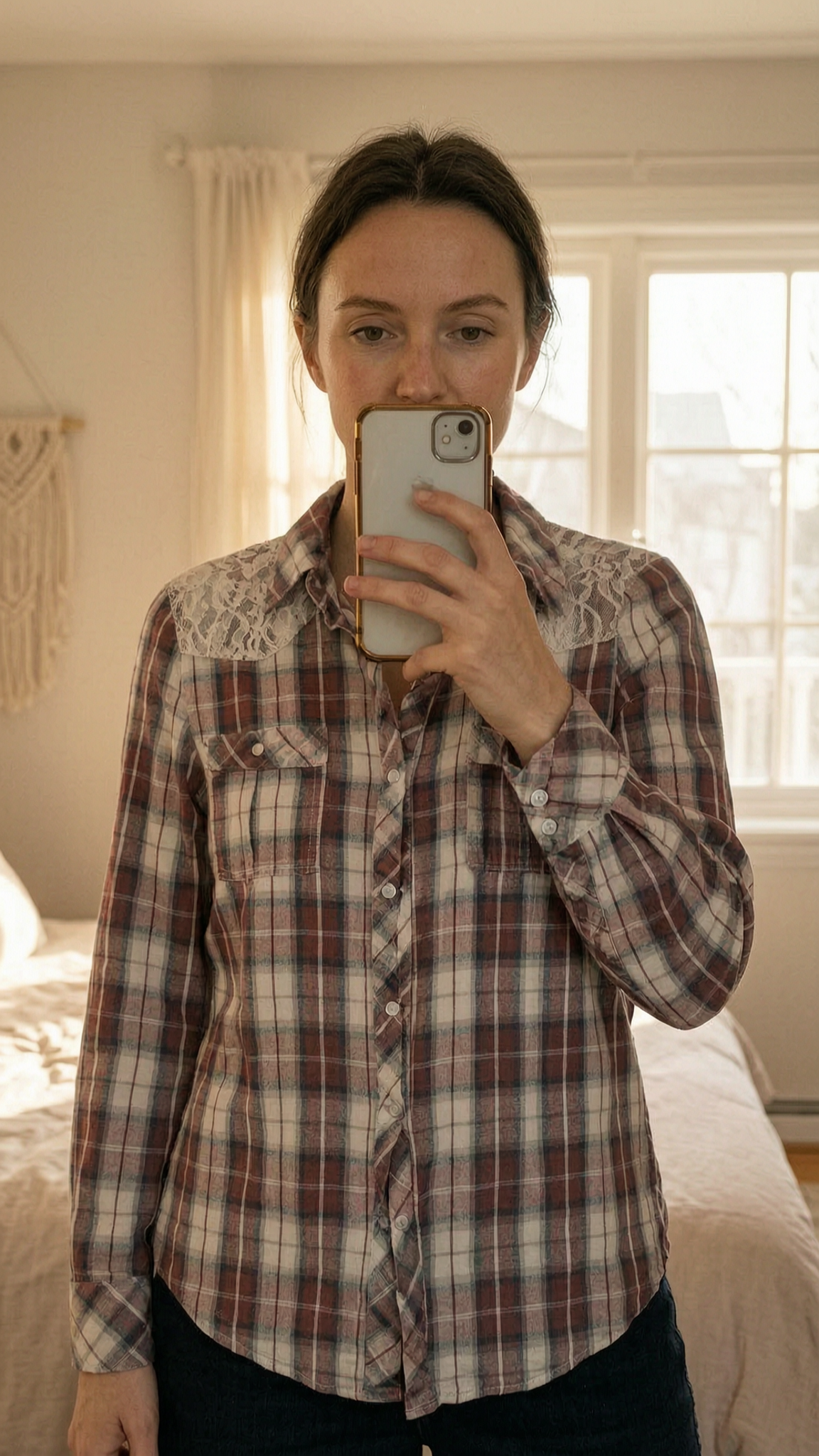 Chemise à carreaux avec dentelle debout, face à la caméra, dans une chambre à la lumière douce, avec une lumière naturelle filtrant par la fenêtre.