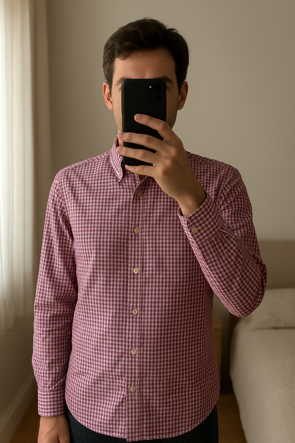 Chemise à carreaux Charles Tyrwhitt debout, face à la caméra, dans une chambre à la lumière douce, avec une lumière naturelle filtrant par la fenêtre.