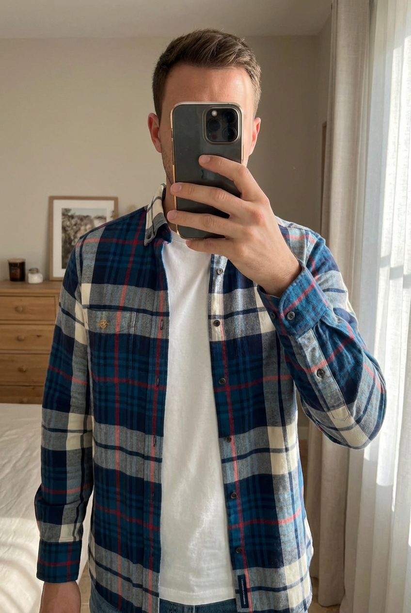 Chemise à carreaux homme GANT debout, face à la caméra, dans une chambre à la lumière douce, avec une lumière naturelle filtrant par la fenêtre.