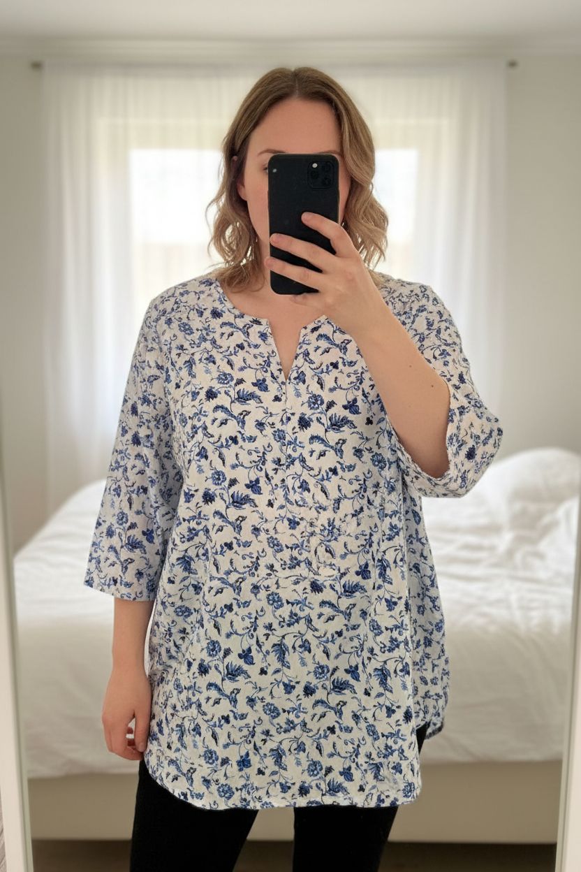 Une personne en Chemise femme manches 3/4 debout, face à la caméra, avec une silhouette légèrement plus ronde, dans une chambre à la lumière douce, avec une lumière naturelle filtrant par la fenêtre.