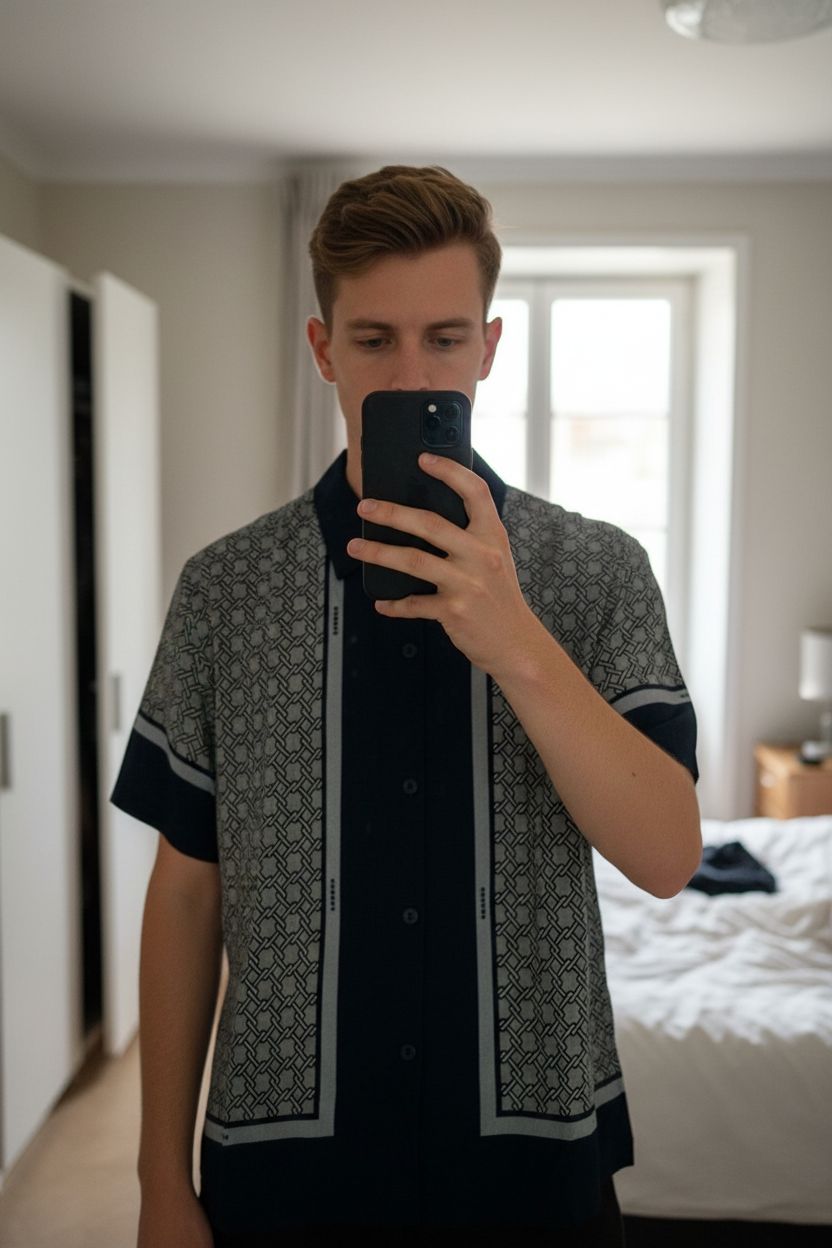 Une personne en Chemise fluide square cross Sandro Homme TM neuf debout, face à la caméra, avec une silhouette fine, dans une chambre à la lumière douce, avec une lumière naturelle filtrant par la fenêtre.