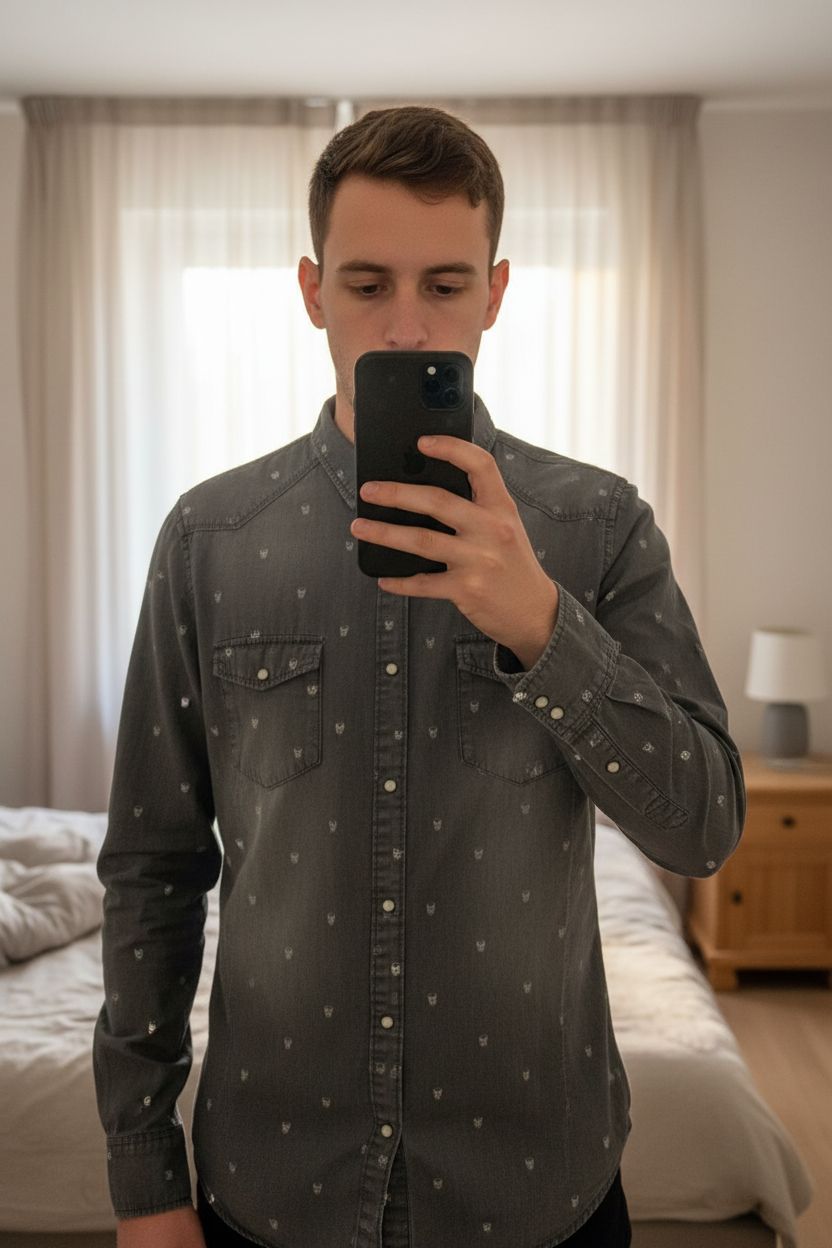 Chemise grise taille L motif tête de mort debout, face à la caméra, dans une chambre à la lumière douce, avec une lumière naturelle filtrant par la fenêtre.