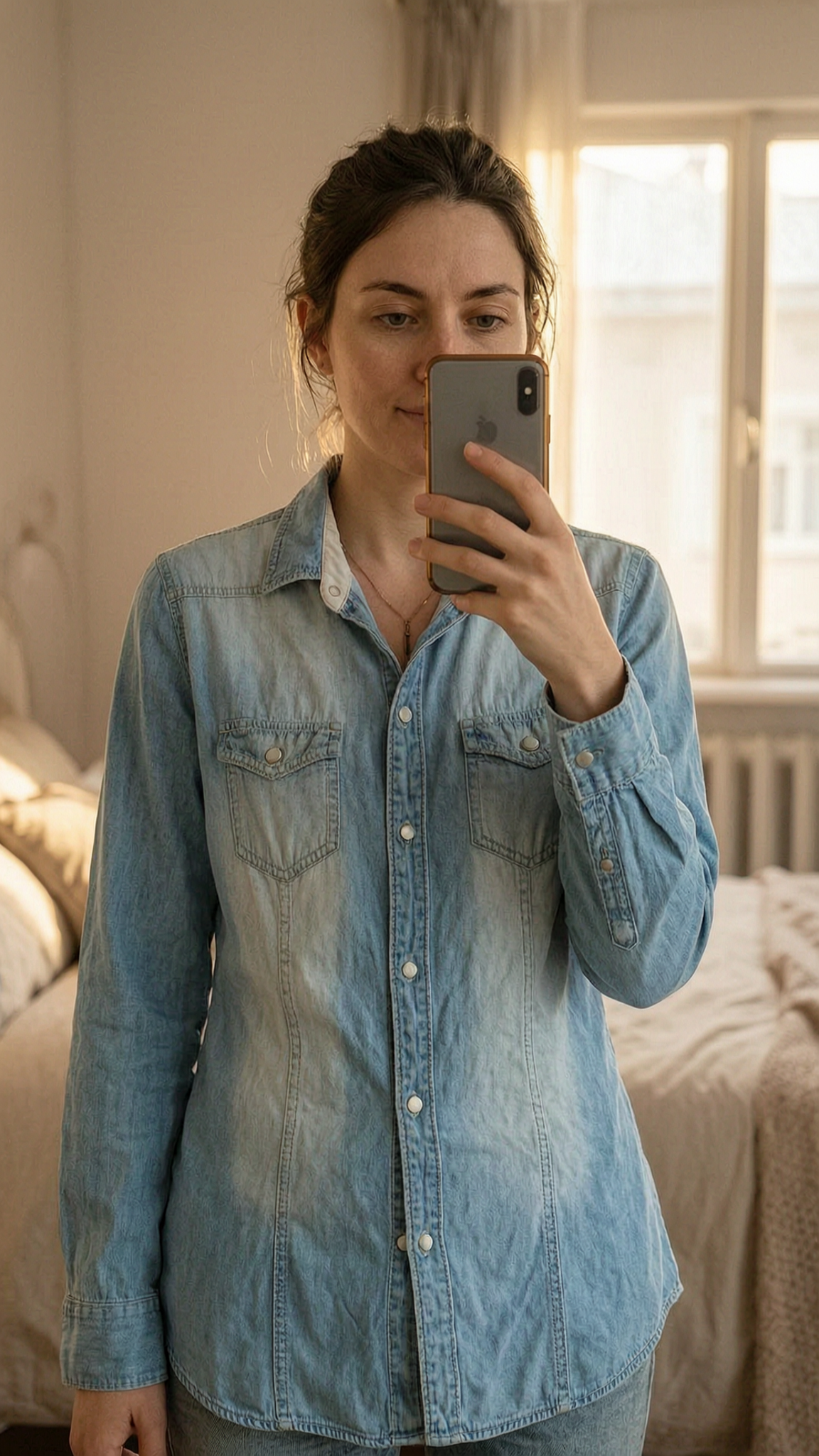 Chemise Jeans délavé debout, face à la caméra, dans une chambre à la lumière douce, avec une lumière naturelle filtrant par la fenêtre.