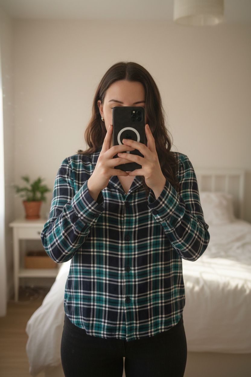 Une personne en Chemise Jennyfer neuve debout, face à la caméra, avec une silhouette légèrement plus ronde, dans une chambre à la lumière douce, avec une lumière naturelle filtrant par la fenêtre.
