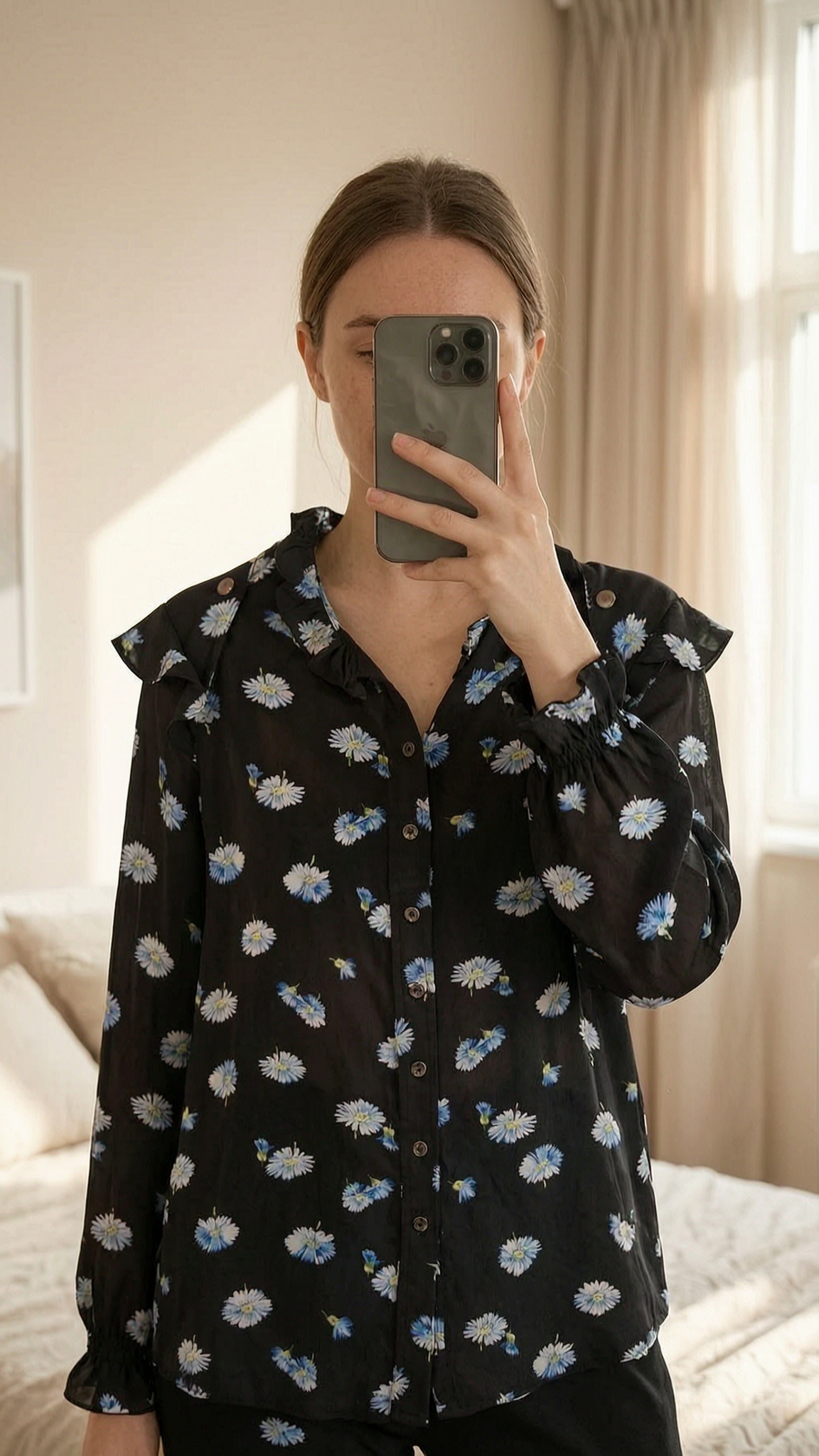 Chemise longue ou tunique en soie the Kooples debout, face à la caméra, dans une chambre à la lumière douce, avec une lumière naturelle filtrant par la fenêtre.