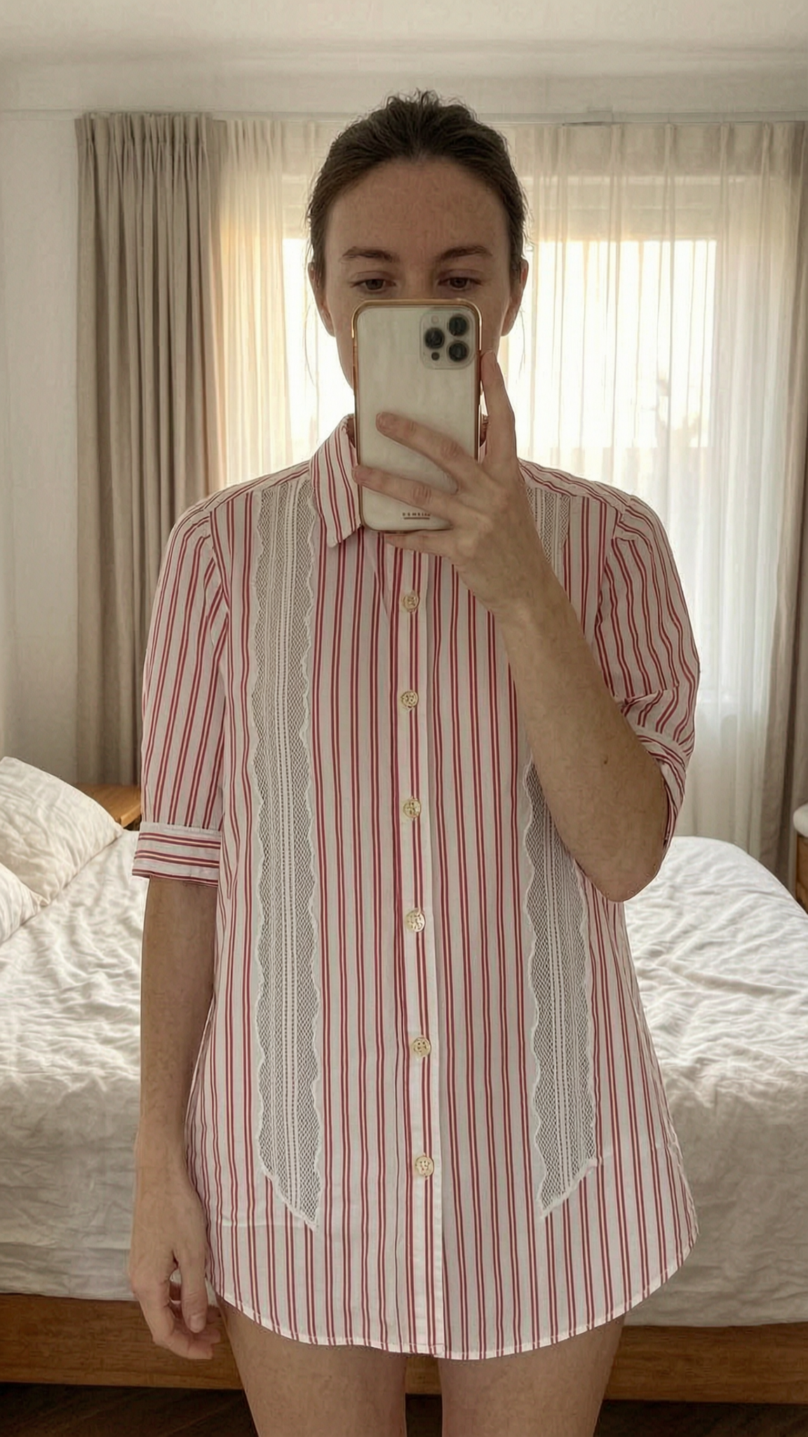 Chemise longue Sandro debout, face à la caméra, dans une chambre à la lumière douce, avec une lumière naturelle filtrant par la fenêtre.