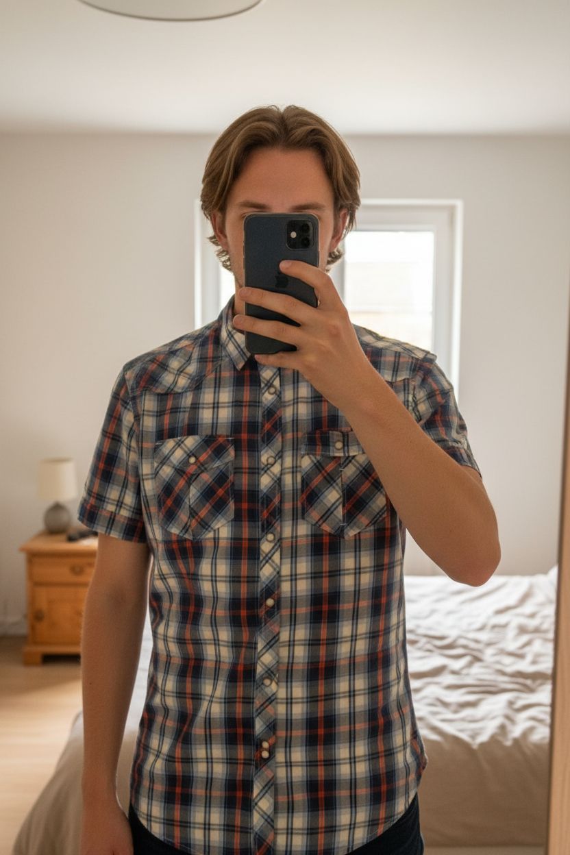 Chemise manches courtes Jack & Jones taille L debout, face à la caméra, dans une chambre à la lumière douce, avec une lumière naturelle filtrant par la fenêtre.