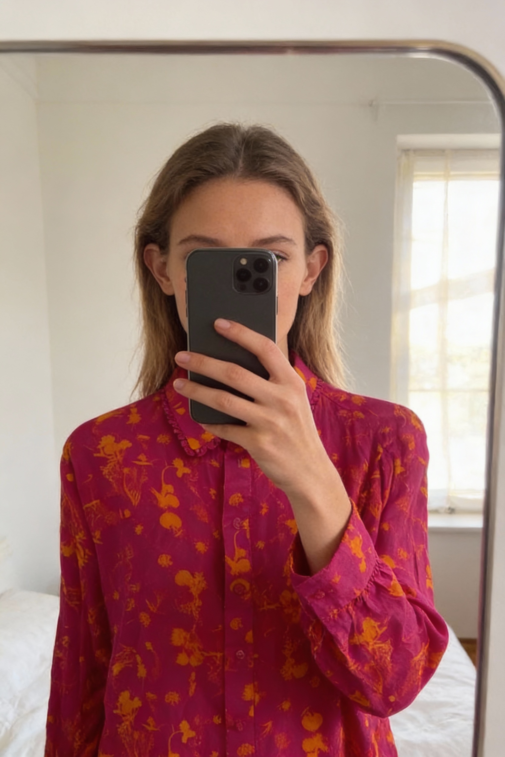 Chemise Modetrotter debout, face à la caméra, dans une chambre à la lumière douce, avec une lumière naturelle filtrant par la fenêtre.