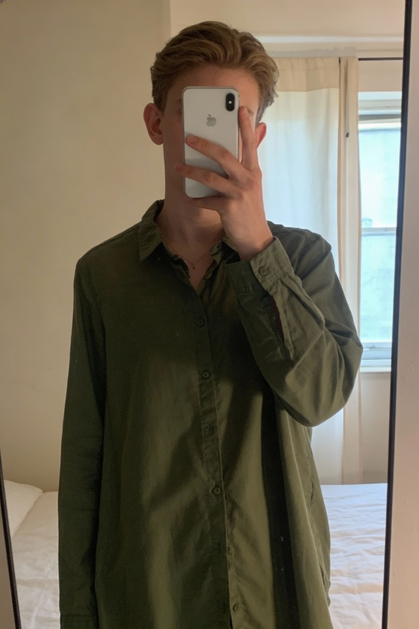 Chemise olive mixte légère boutonnée debout, face à la caméra, dans une chambre à la lumière douce, avec une lumière naturelle filtrant par la fenêtre.