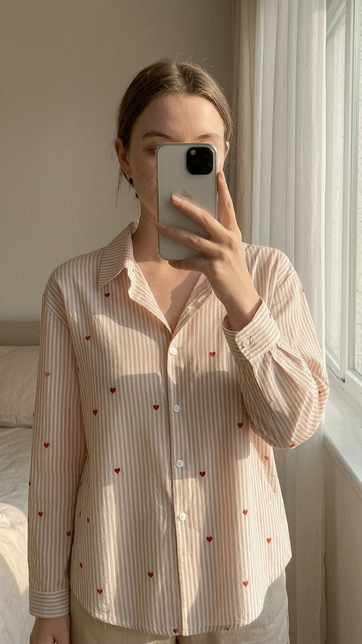 Chemise rayée beige cœurs rouges oversize taille M debout, face à la caméra, dans une chambre à la lumière douce, avec une lumière naturelle filtrant par la fenêtre.