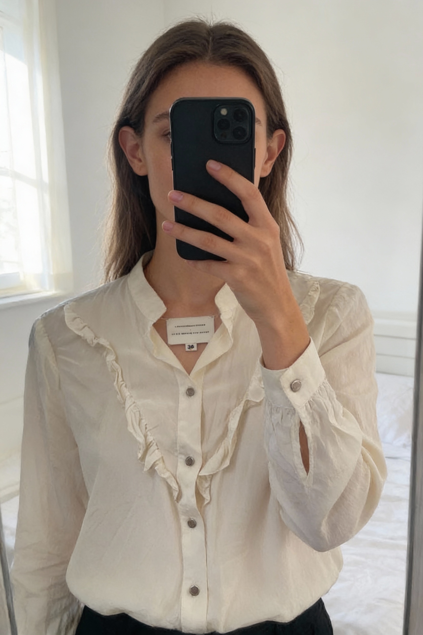 Chemise Sezane x Le bon marché debout, face à la caméra, dans une chambre à la lumière douce, avec une lumière naturelle filtrant par la fenêtre.