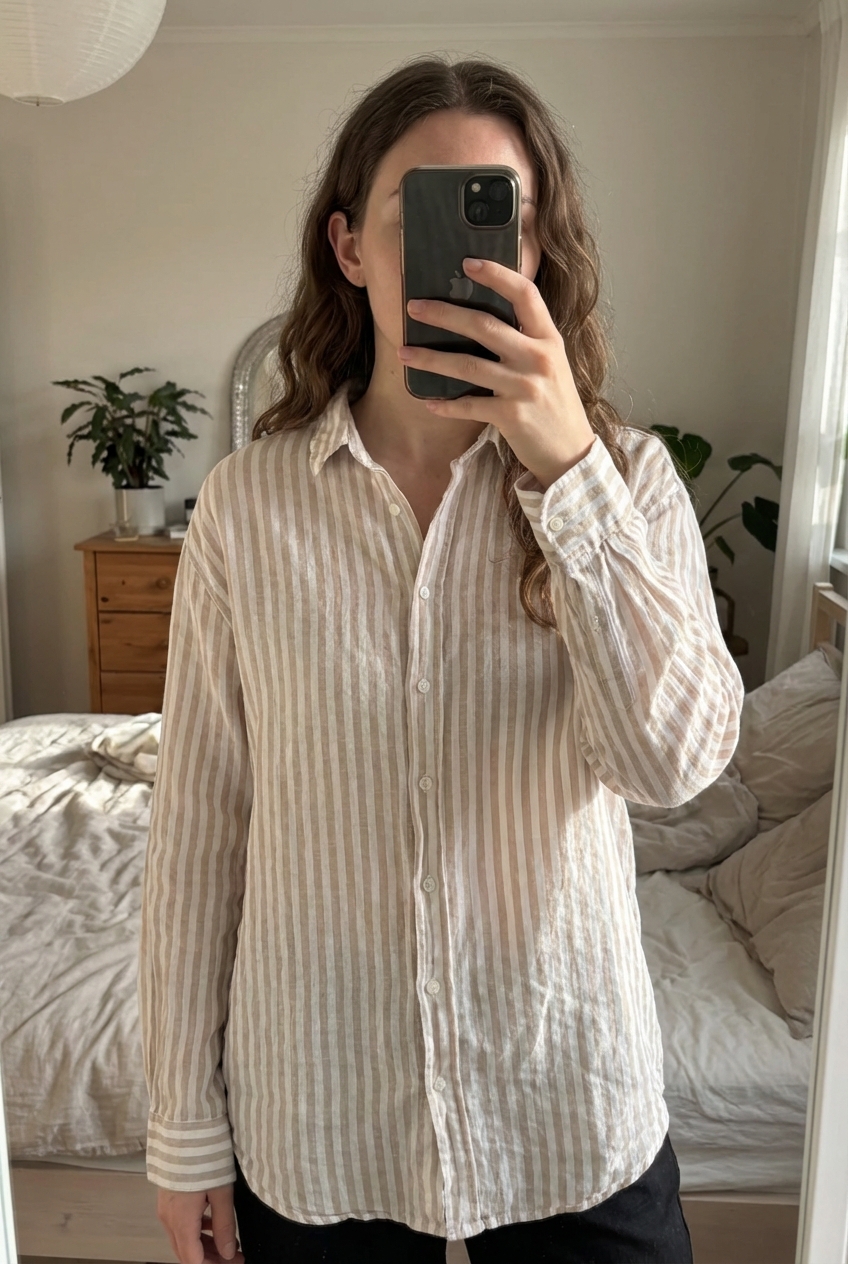 Chemise stradivarius debout, face à la caméra, dans une chambre à la lumière douce, avec une lumière naturelle filtrant par la fenêtre.