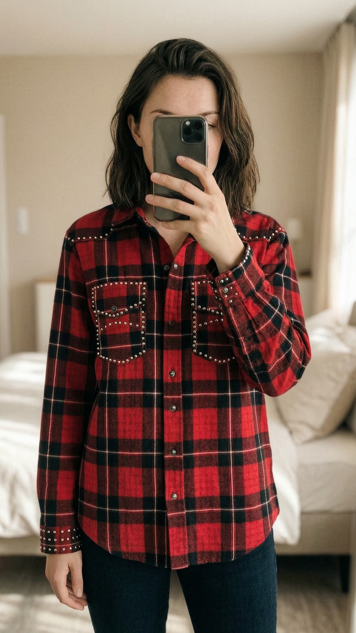 Chemise the Kooples debout, face à la caméra, dans une chambre à la lumière douce, avec une lumière naturelle filtrant par la fenêtre.
