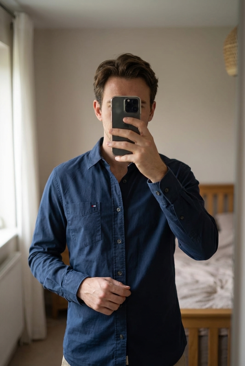 Chemise Tommy Hilfiger debout, face à la caméra, dans une chambre à la lumière douce, avec une lumière naturelle filtrant par la fenêtre.