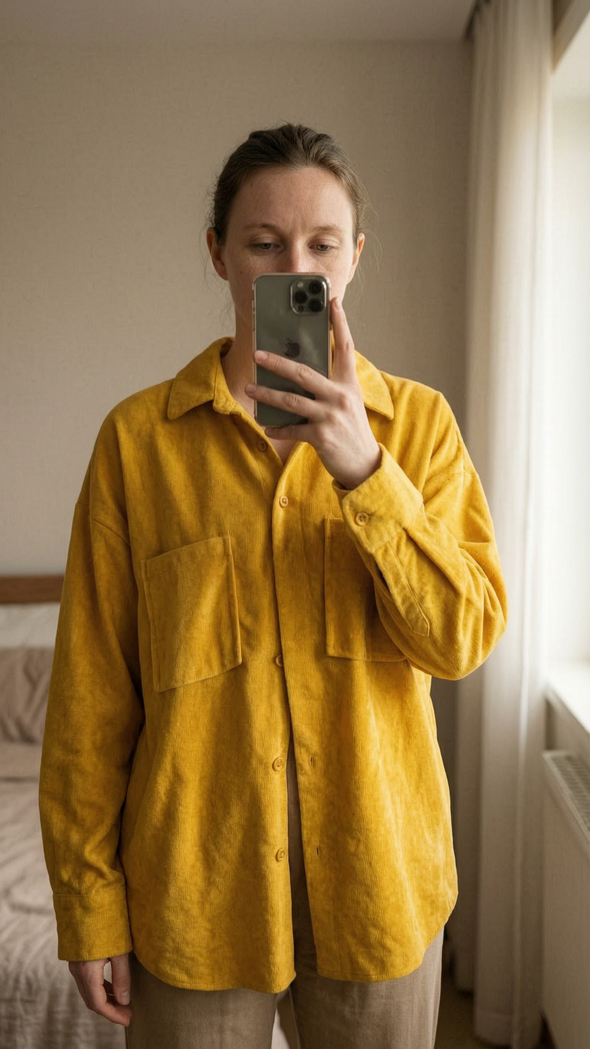 Chemise velours, taille unique debout, face à la caméra, dans une chambre à la lumière douce, avec une lumière naturelle filtrant par la fenêtre.