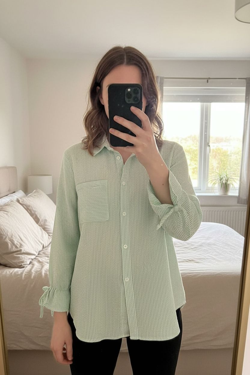 Chemise verte debout, face à la caméra, dans une chambre à la lumière douce, avec une lumière naturelle filtrant par la fenêtre.