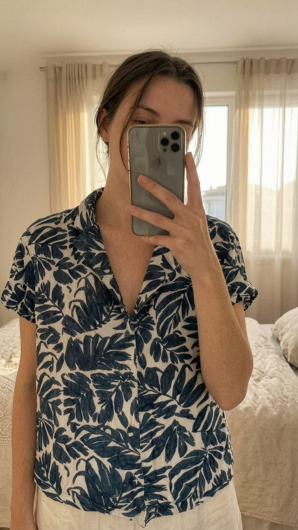 Chemisier croc bleu/blanc Shein debout, face à la caméra, dans une chambre à la lumière douce, avec une lumière naturelle filtrant par la fenêtre.