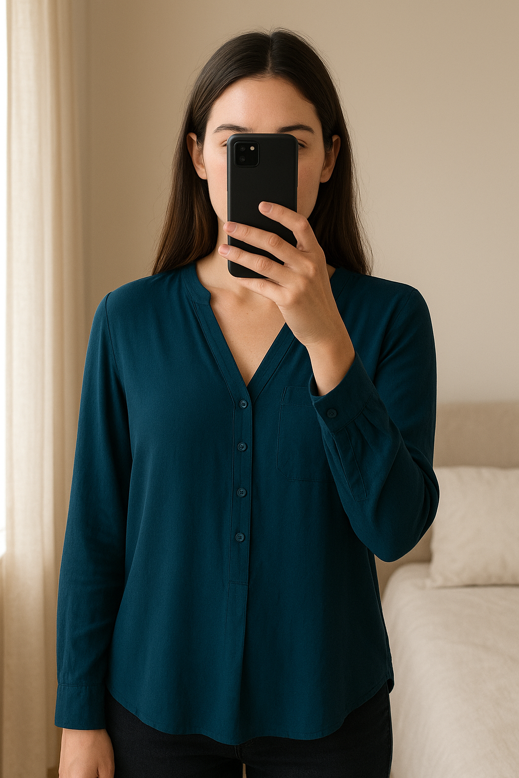 Chemisier léger pour femme couleur bleue/vert canard debout, face à la caméra, dans une chambre à la lumière douce, avec une lumière naturelle filtrant par la fenêtre.