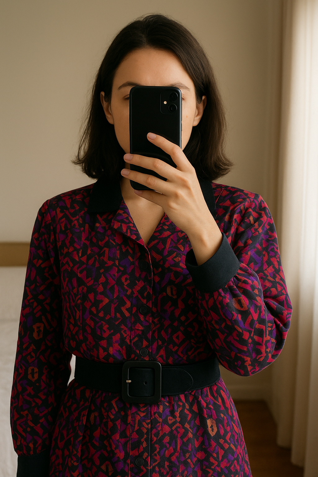 Chemisier veste vintage forme géométrique année 90 - ceinturé - Made in France - Taille 42 debout, face à la caméra, dans une chambre à la lumière douce, avec une lumière naturelle filtrant par la fenêtre.