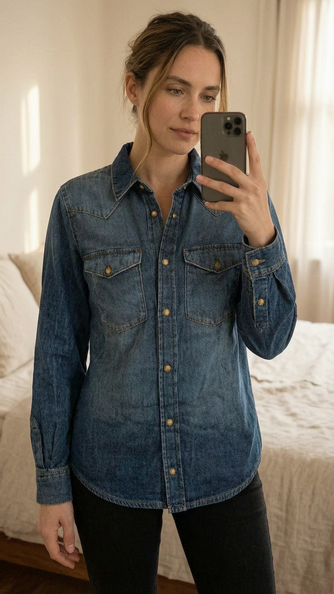 Chemisier Walter ba&sh neuf debout, face à la caméra, dans une chambre à la lumière douce, avec une lumière naturelle filtrant par la fenêtre.