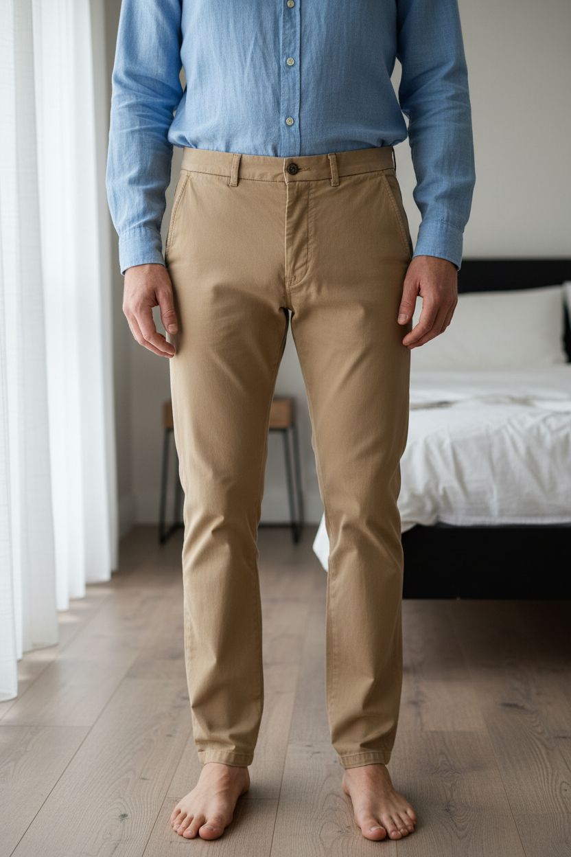 Chino Tom Beige Octobre-éditions debout, face à la caméra, dans une chambre à la lumière douce, avec une lumière naturelle filtrant par la fenêtre.