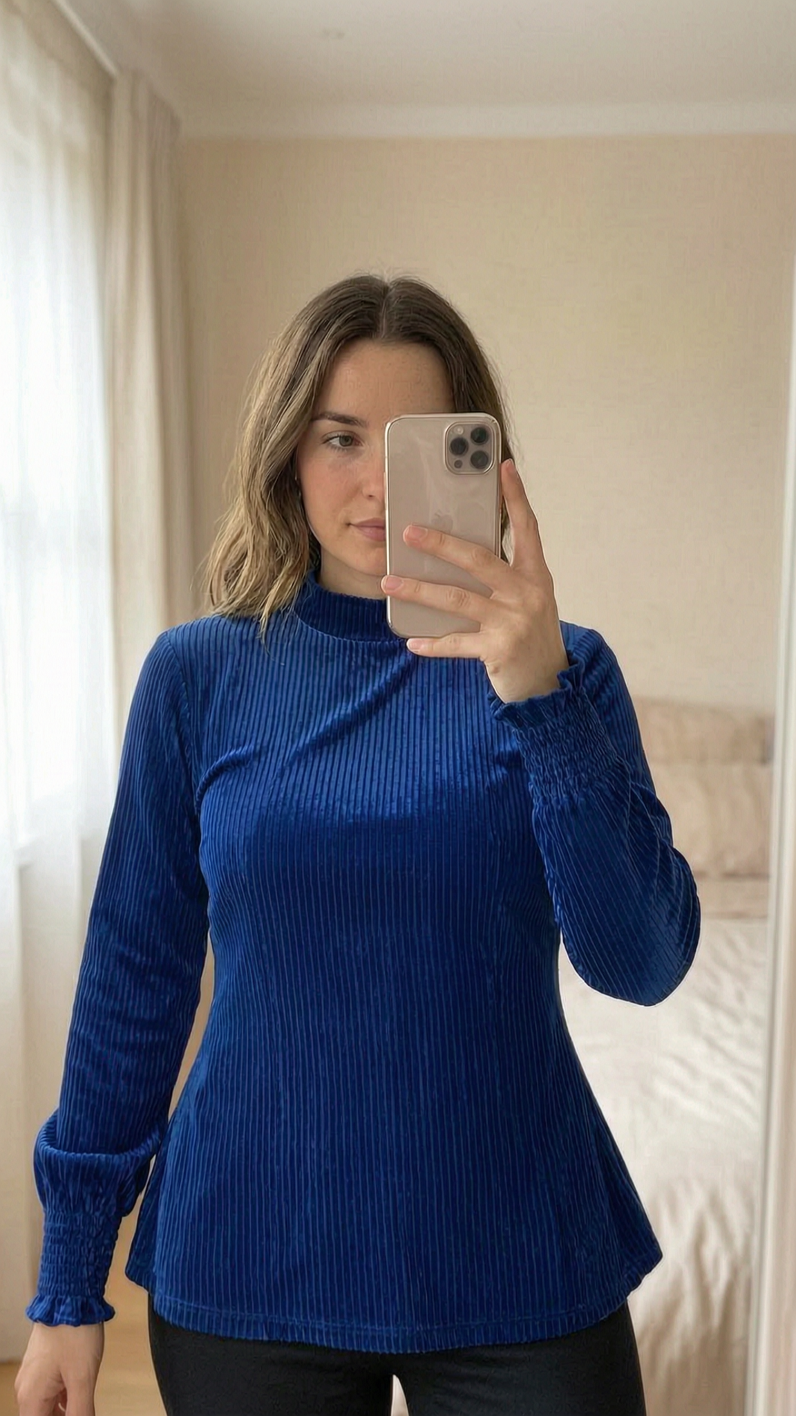 CL Essentials - Haut en velours - bleu - XL/42/14 - Etat tres bon debout, face à la caméra, dans une chambre à la lumière douce, avec une lumière naturelle filtrant par la fenêtre.