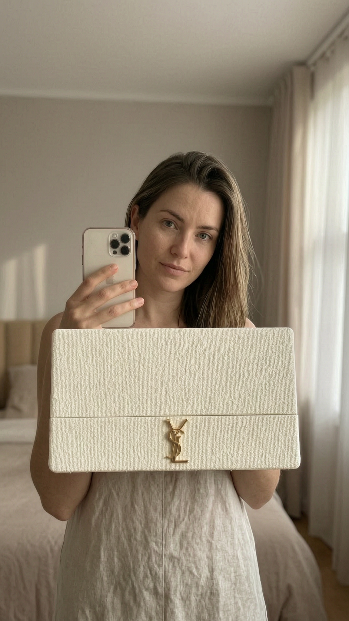 Coffre à bijoux debout, face à la caméra, dans une chambre à la lumière douce, avec une lumière naturelle filtrant par la fenêtre.