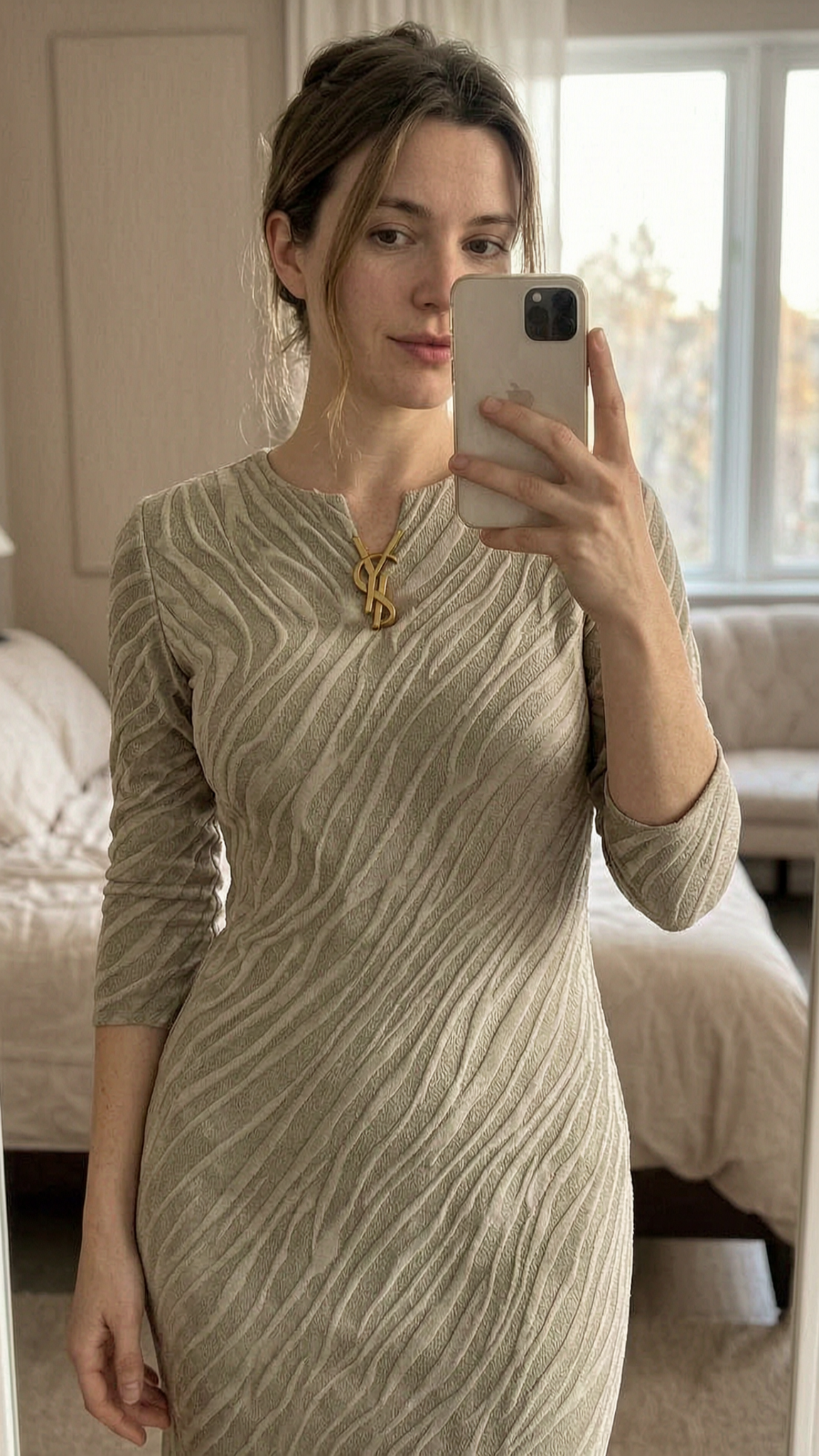 Coffret debout, face à la caméra, dans une chambre à la lumière douce, avec une lumière naturelle filtrant par la fenêtre.