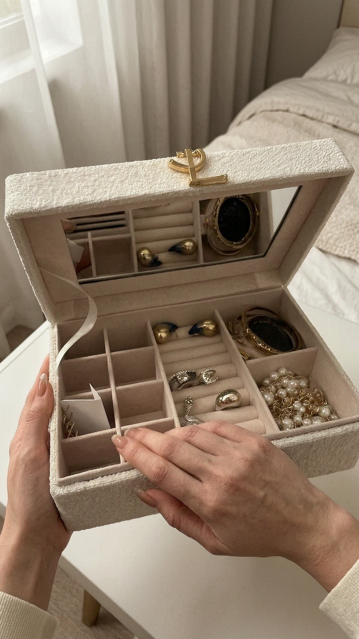 Coffret Yves saint Laurent bijoux debout, face à la caméra, dans une chambre à la lumière douce, avec une lumière naturelle filtrant par la fenêtre.