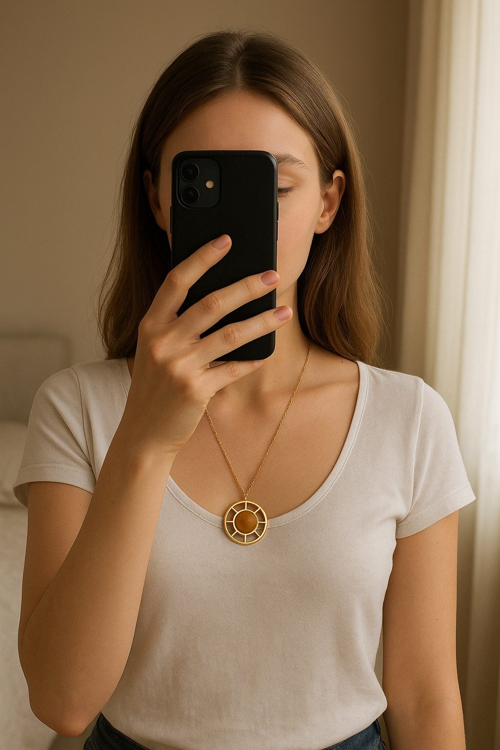 Collier amulet or & œil-de-tigre Holzkern debout, face à la caméra, dans une chambre à la lumière douce, avec une lumière naturelle filtrant par la fenêtre.