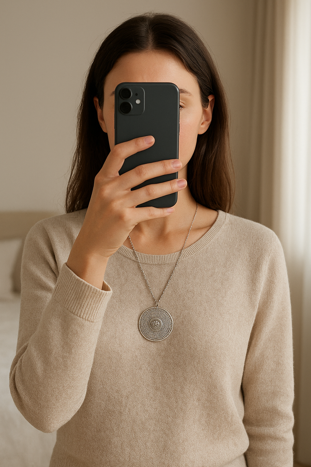 collier gas debout, face à la caméra, dans une chambre à la lumière douce, avec une lumière naturelle filtrant par la fenêtre.
