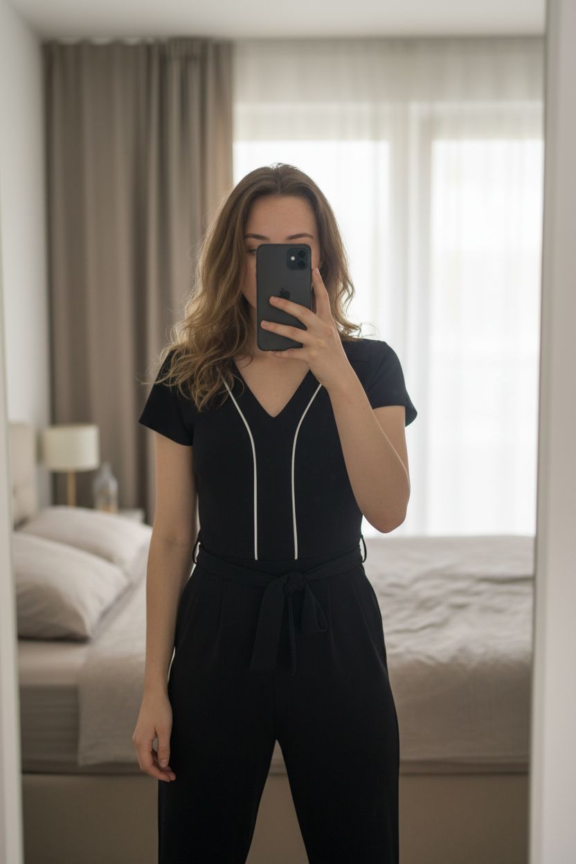 Combi pantalon bleu marine Morgan taille 40 debout, face à la caméra, dans une chambre à la lumière douce, avec une lumière naturelle filtrant par la fenêtre.