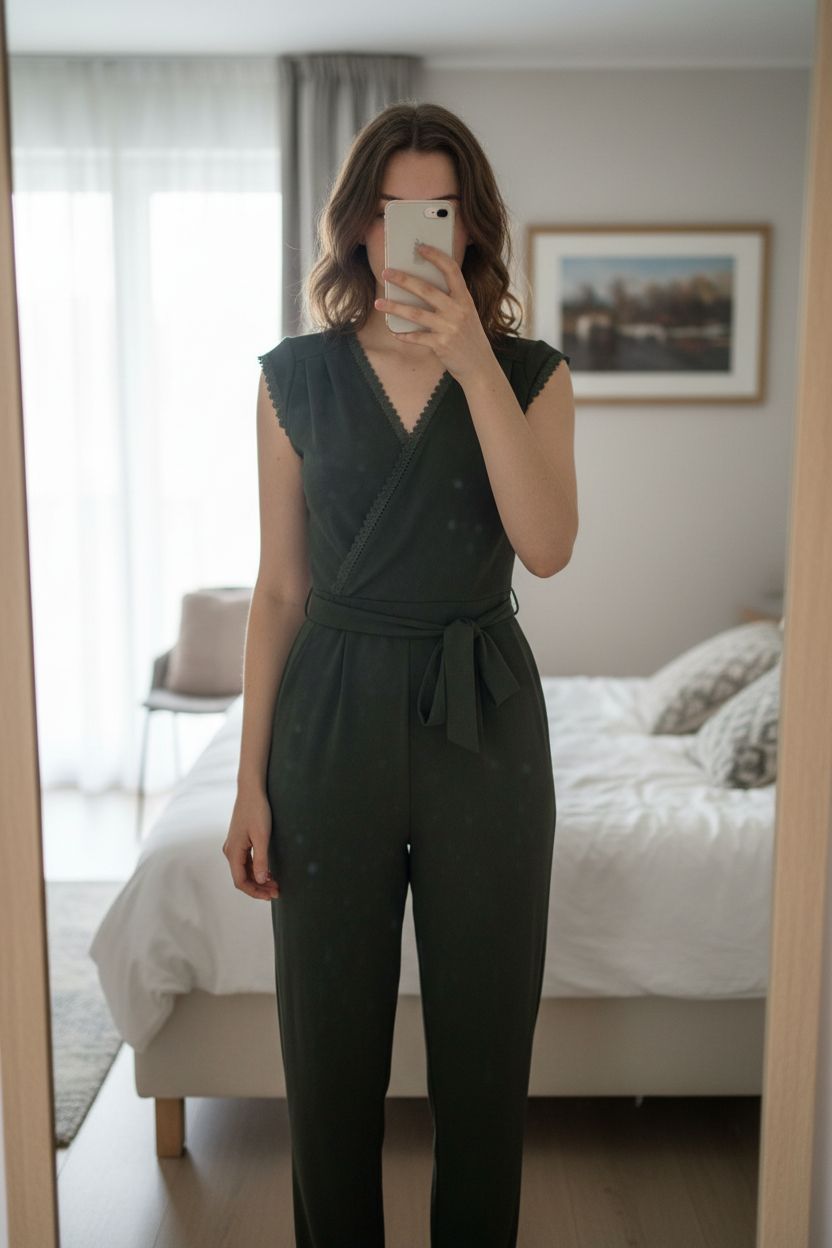 Combi pantalon Morgan taille 38 kaki debout, face à la caméra, dans une chambre à la lumière douce, avec une lumière naturelle filtrant par la fenêtre.