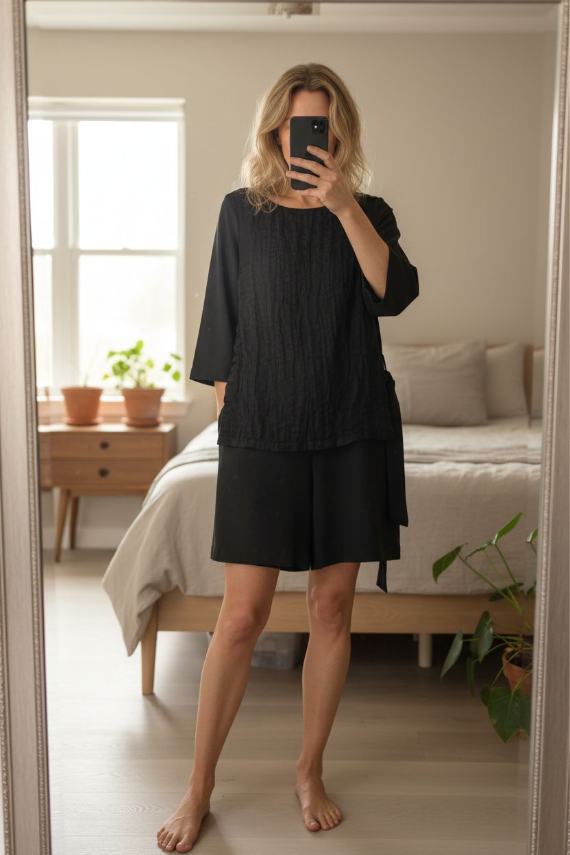 Combi short bermuda debout, face à la caméra, dans une chambre à la lumière douce, avec une lumière naturelle filtrant par la fenêtre.