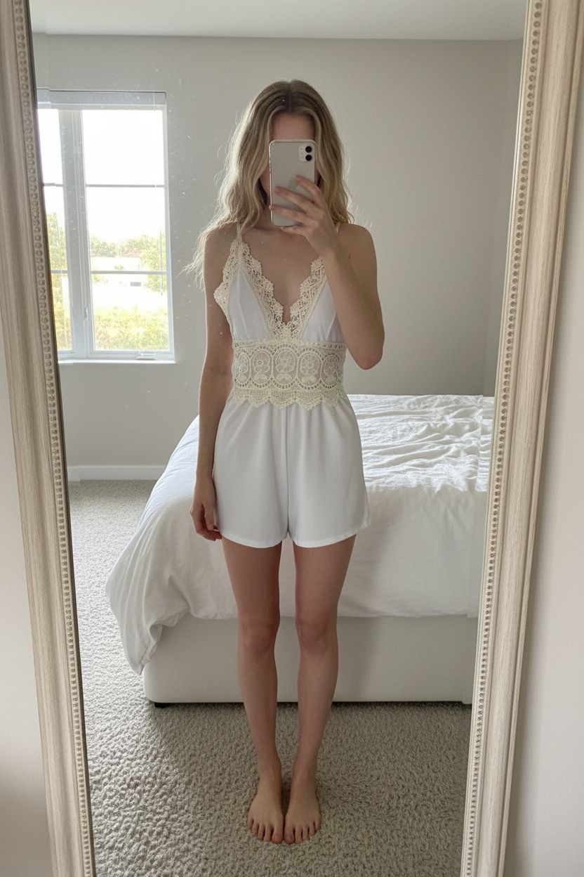 Combi short blanche debout, face à la caméra, dans une chambre à la lumière douce, avec une lumière naturelle filtrant par la fenêtre.