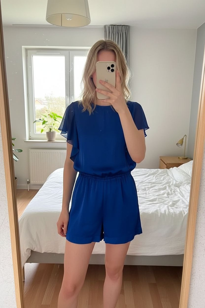 Combi-short bleu nuit debout, face à la caméra, dans une chambre à la lumière douce, avec une lumière naturelle filtrant par la fenêtre.