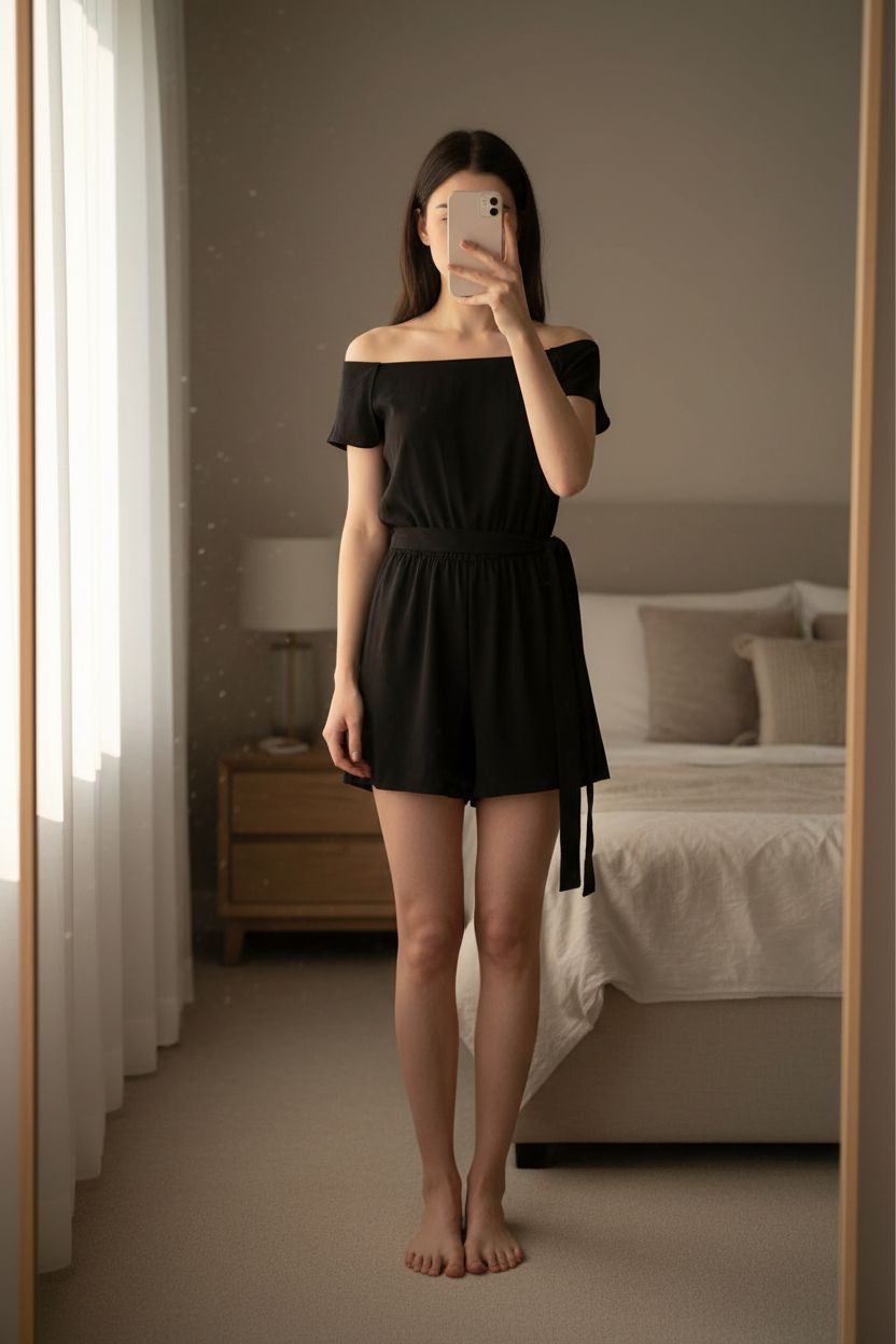 Combi short limbobis debout, face à la caméra, dans une chambre à la lumière douce, avec une lumière naturelle filtrant par la fenêtre.