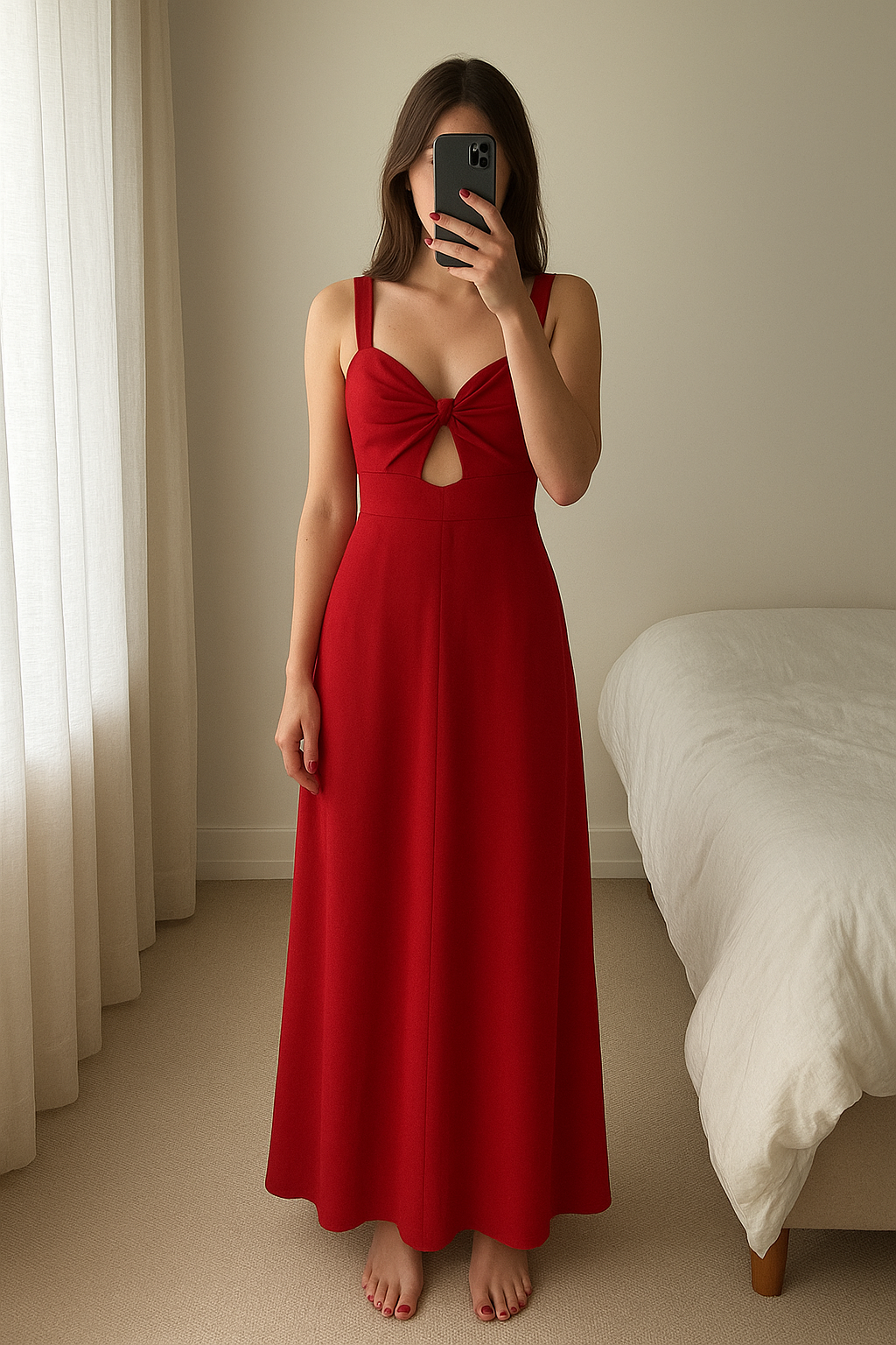 Combinaison d’été debout, face à la caméra, dans une chambre à la lumière douce, avec une lumière naturelle filtrant par la fenêtre.
