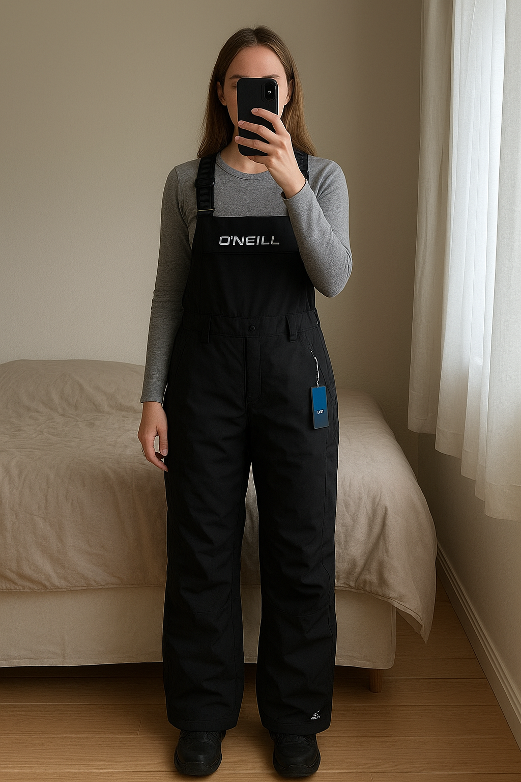 Combinaison de ski Oneill TM🌱 debout, face à la caméra, dans une chambre à la lumière douce, avec une lumière naturelle filtrant par la fenêtre.