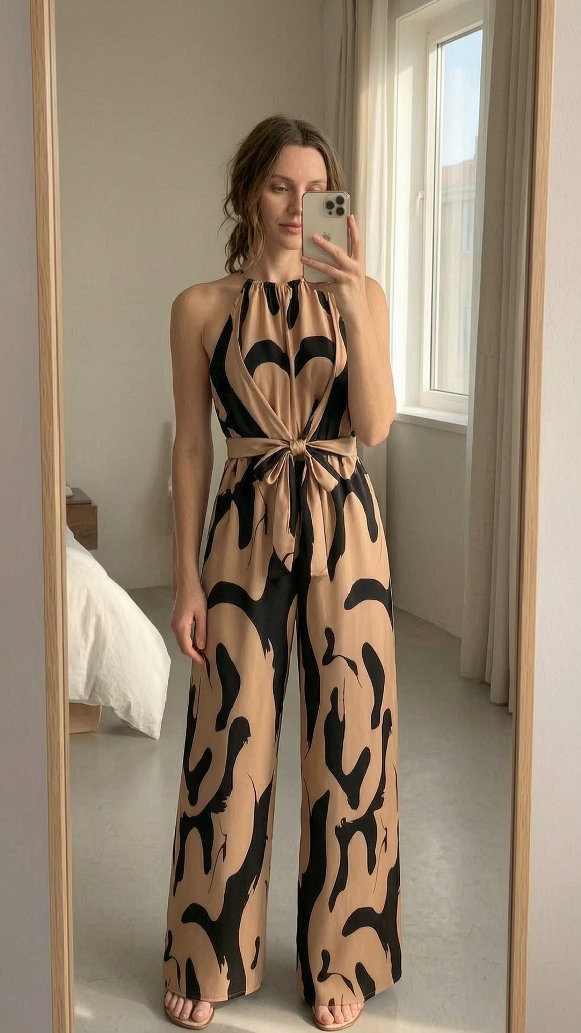 Combinaison fluide imprimé beige noir col halter M été chic debout, face à la caméra, dans une chambre à la lumière douce, avec une lumière naturelle filtrant par la fenêtre.